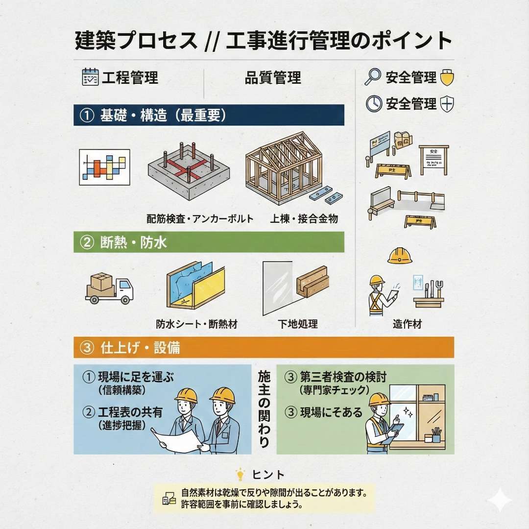 新築工事が始まったら、進行管理が欠かせません。工務店との連携を取り、スケジュール通りに工事が進んでいるか、定期的に現場を訪れることが大切です。工事が予定通り進んでいない場合は、迅速に対処する必要があります。また、工事中に変更したい点や改善したい点があれば、早めに伝えましょう。